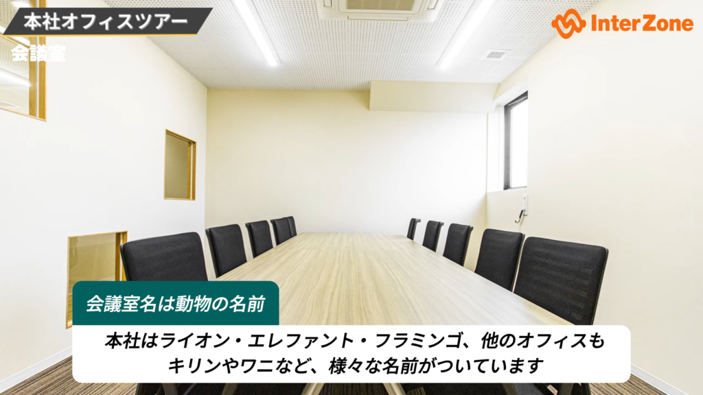 インターゾーンの会議室は、すべて動物の名前が付けられています。本社には「ライオン」「エレファント」「フラミンゴ」があり、他のオフィスでもさまざまな動物の名前が使われています。